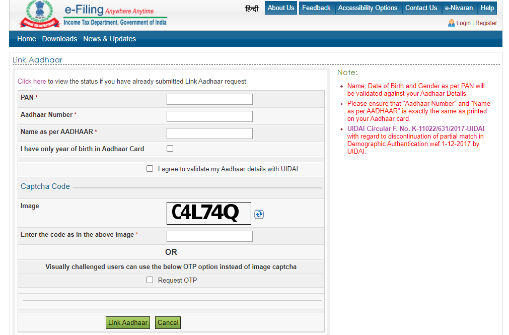 How to Link PAN Card to Aadhaar Card Online through e-Filing Website. Visit the Income Tax e-Filing website and click on the ‘Link Aadhaar‘ option under the quick links. Enter your PAN and Aadhaar number. Enter the name as mentioned in your Aadhaar card.